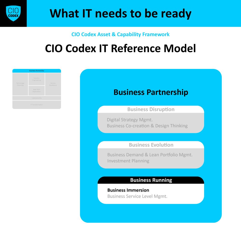Business Immersion, situada na macro capability Business Running e fazendo parte da camada Business Partnership no CIO Codex Capability Framework, é uma capability essencial na ponte entre os mundos da Tecnologia da Informação e do negócio, garantindo uma colaboração efetiva e a criação de soluções tecnológicas que estejam profundamente integradas e alinhadas às necessidades operacionais e estratégicas das organizações.