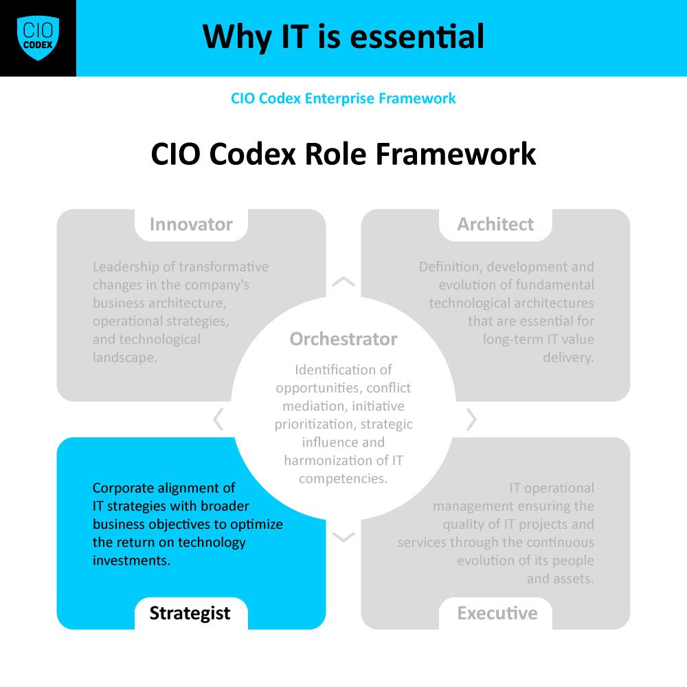 - Um CIO no eixo Strategist deve ter uma compreensão profunda dos princípios de negócios e do mercado em que a empresa opera.