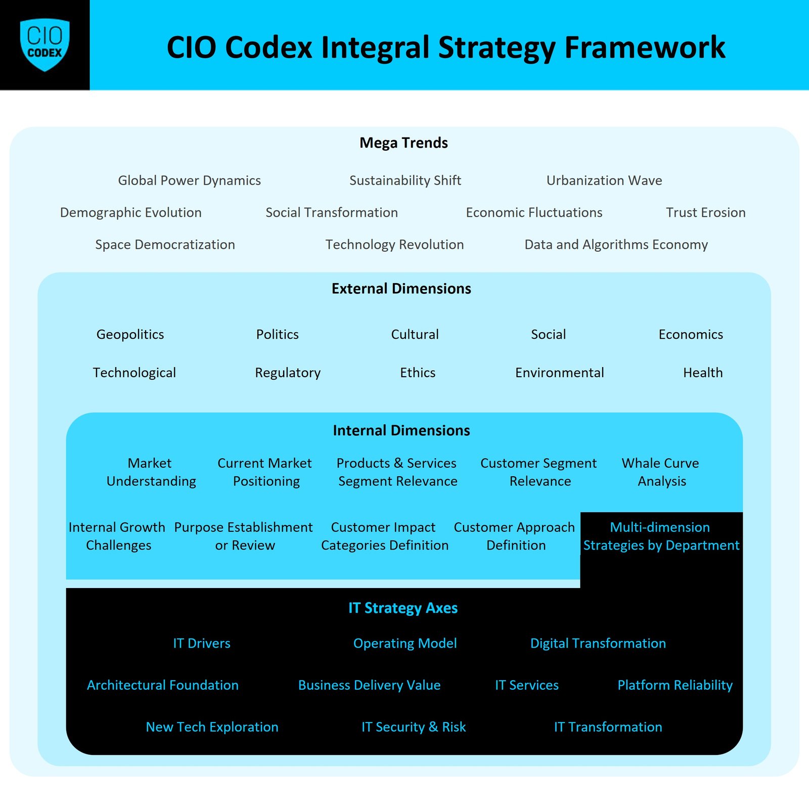 O CIO Codex Integral Strategy Framework foi concebido para fornecer uma abordagem estratégica abrangente que considera tanto as dimensões internas quanto as externas, as megatendências globais e a estratégia de TI de uma organização.