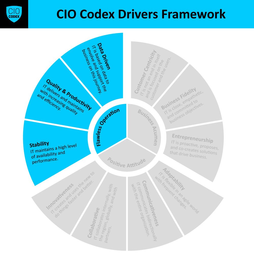 O eixo Flawless Operation dentro do CIO Codex Drivers Framework simboliza a essência de uma área de Tecnologia da Informação que opera sem falhas, onde a estabilidade, qualidade, produtividade e uma orientação baseada em dados são as forças motrizes.