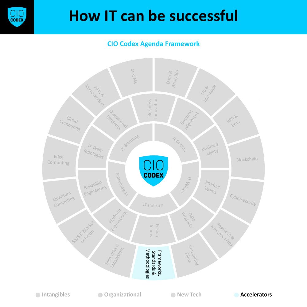 Dentro da camada Accelerator do CIO Codex Agenda Framework, o tema Frameworks, Standards & Methodologies se apresenta como um elemento crucial para a estruturação, eficiência e sucesso de projetos de TI.