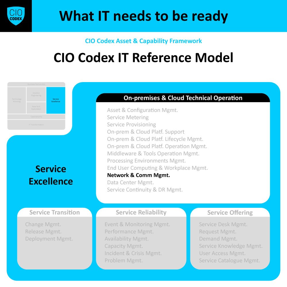 A capability de Network & Communications Management é fundamental para o bom funcionamento da infraestrutura de TI de uma organização, enquadrando-se na macro capability On premises & Cloud Technical Operation e na camada de Service Excellence do CIO Codex Capability Framework.