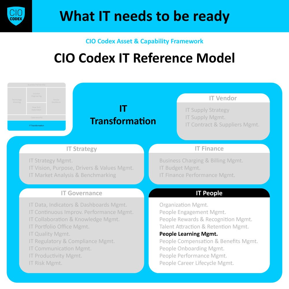 A People Learning Management, inserida no escopo da macro capability IT People na camada IT Transformation do CIO Codex Capability Framework, desempenha um papel fundamental na capacitação e atualização contínua da equipe de TI.