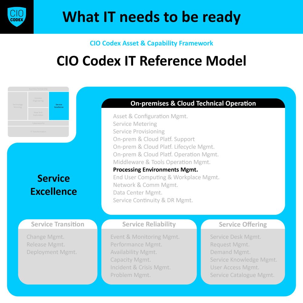 A capability de Processing Environments Management é uma das pedras angulares da macro capability On premises & Cloud Technical Operation, dentro da camada Service Excellence do CIO Codex Capability Framework.