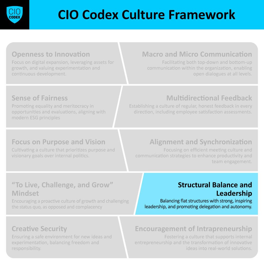 O traço Structural Balance and Leadership do CIO Codex Culture Framework aborda precisamente a necessidade de equilibrar a estrutura organizacional com o papel vital da liderança, reconhecendo a importância de cada um desses aspectos na promoção de uma cultura corporativa saudável e produtiva.