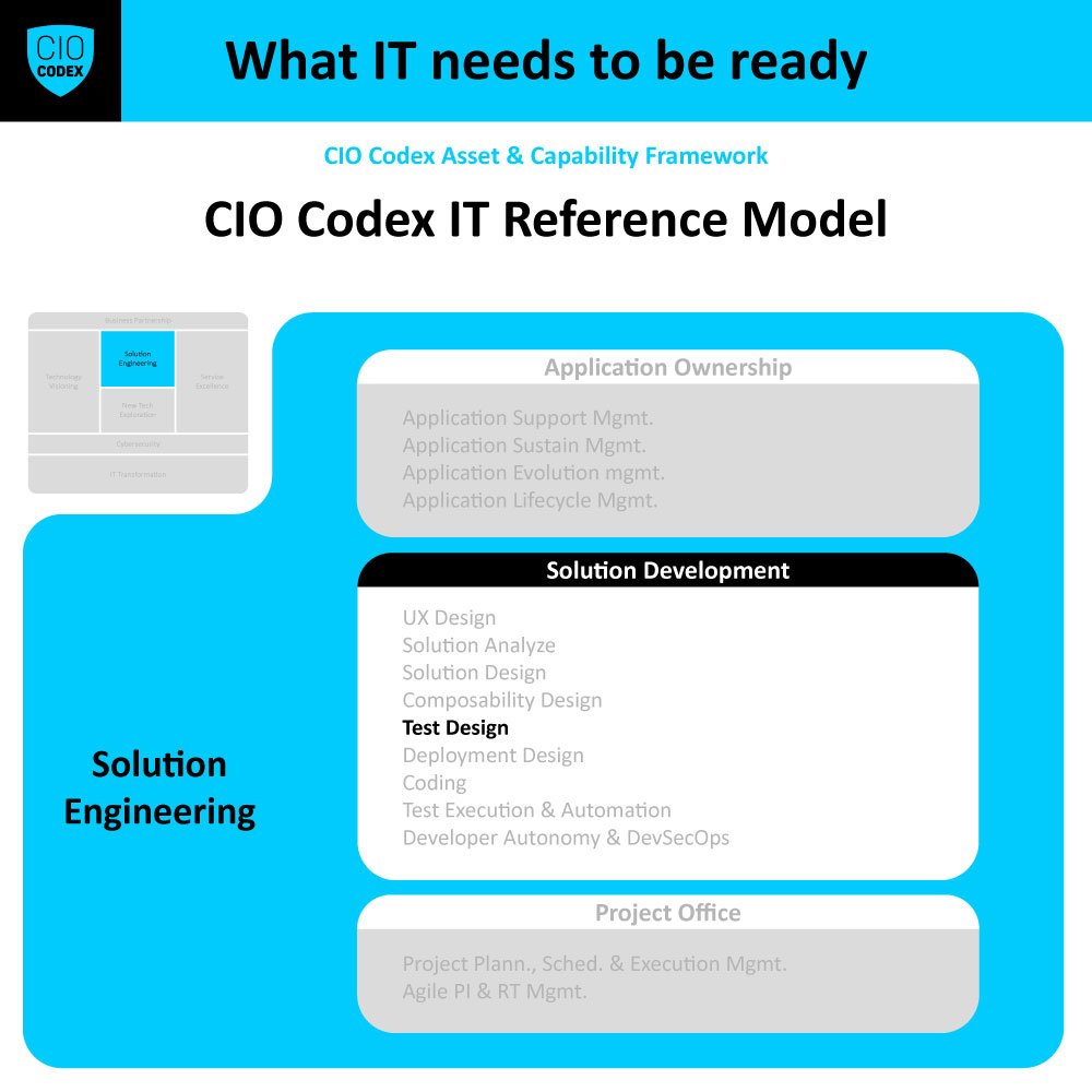 A capability Test Design, inserida na macro capability Solution Development e na camada Solution Engineering do CIO Codex Capability Framework, desempenha um papel fundamental na criação de planos e casos de teste para garantir que as soluções desenvolvidas funcionem conforme esperado.